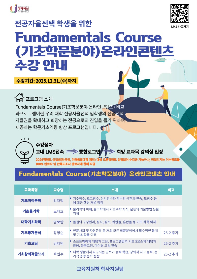 fnctId=bbs,fnctNo=669 [혁신사업]전공자율선택 학생을 위한 Fundamentals Course(기초학문분야 온라인콘텐츠) 프로그램 안내 작성일2025.09.24 수정일2025.09.24 작성자 이*롬 조회수82 첨부파일 첨부파일이(가) 없습니다.