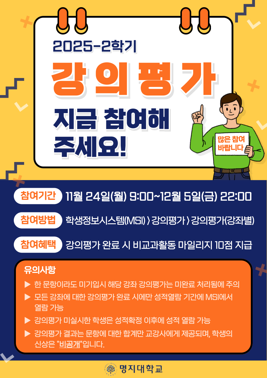 fnctId=bbs,fnctNo=669 2025학년도 2학기 강의평가 실시 안내 작성일2025.11.21 수정일2025.11.21 작성자 이*롬 조회수31 ※ 자세한 사항은 명지대학교 홈페이지 학사공지 [2025학년도 2학기 강의 실시 안내]를 참고해주시길 바랍니다. 첨부파일 첨부파일이(가) 없습니다.